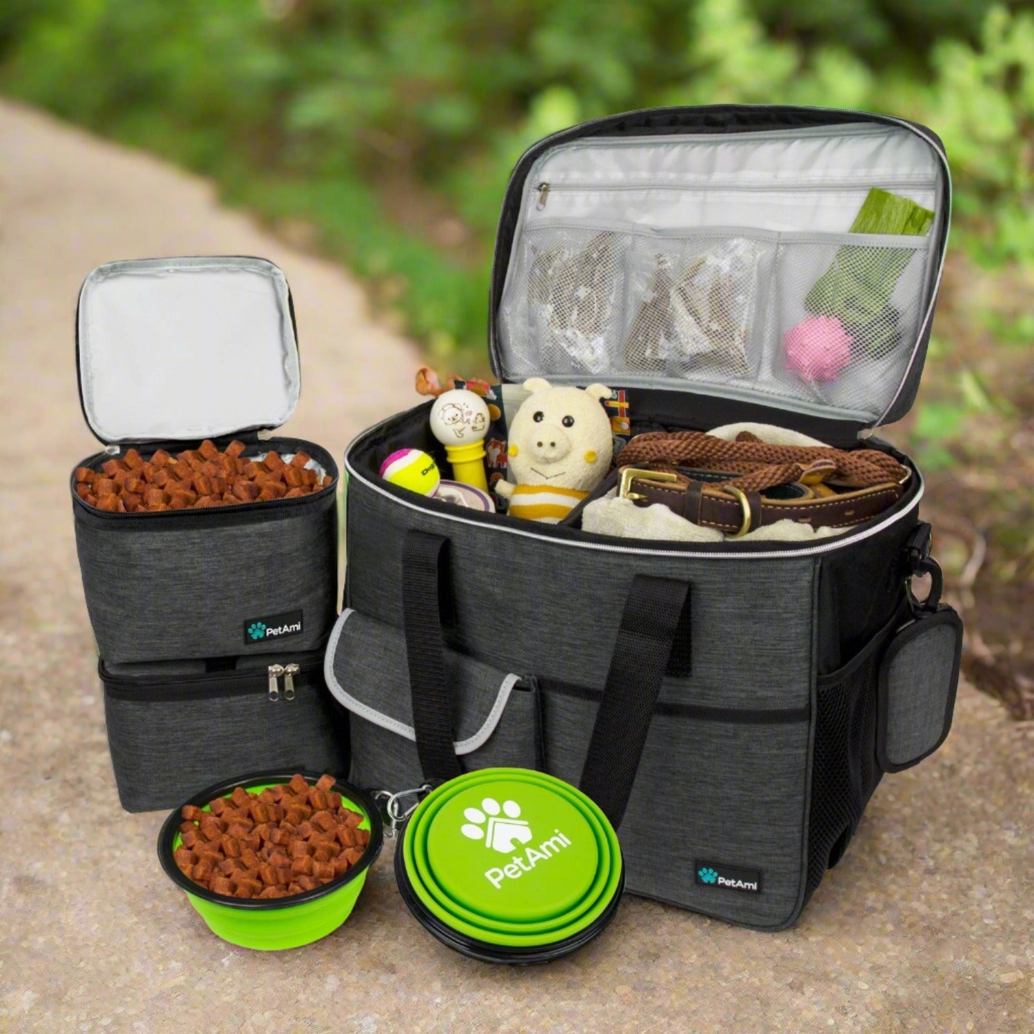 Elevate your pet's travel experience with our Deluxe Pet Travel Set Organizer Tote Bag! This spacious and lightweight bag keeps all pet essentials organized, making your journeys stress-free.