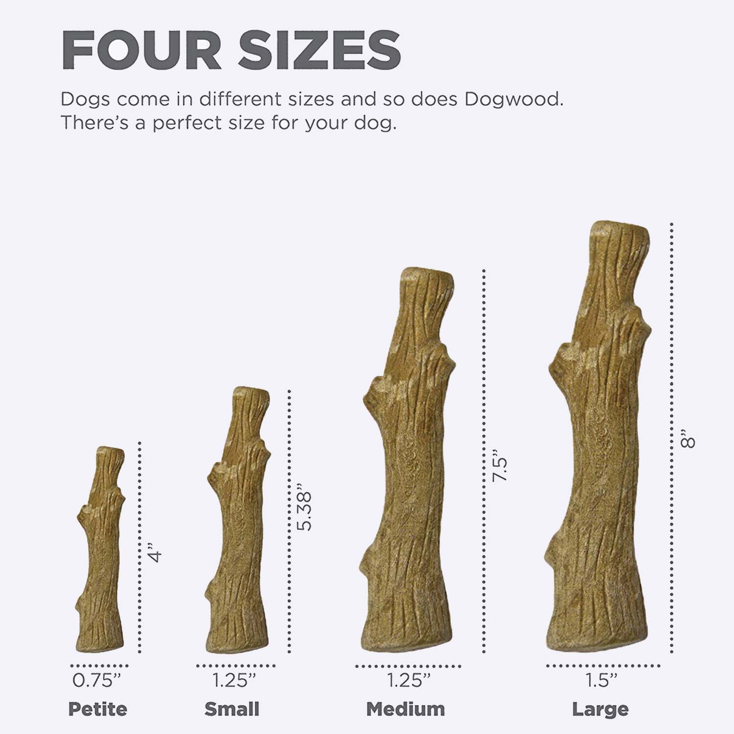 Satisfy the natural instinct to chew with Dogwood. Dogwood is a dog chew with the natural flavor and smell of wood that won't splinter like regular sticks. Dogwood materials are made in the USA are free of lead and phthalates making it a chew you can feel good about giving your dog, and your dog will feel good chewing on. Available in 4 sizes ranging from 'Petite' to 'Large,' there's a chew that's perfectly sized for every dog!