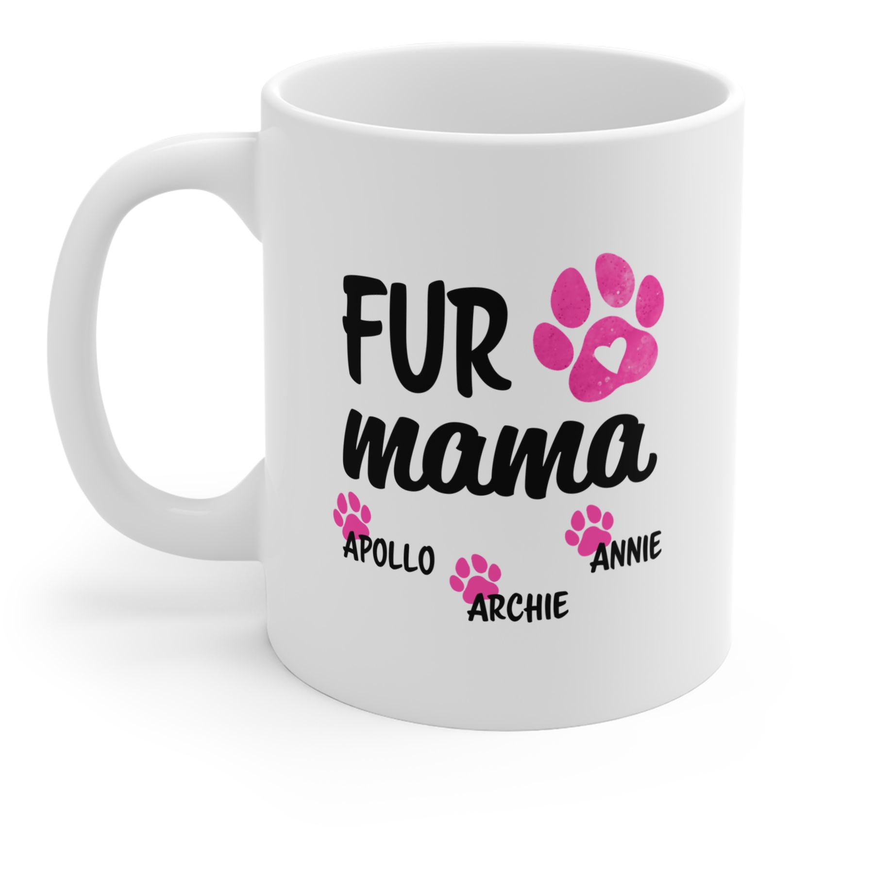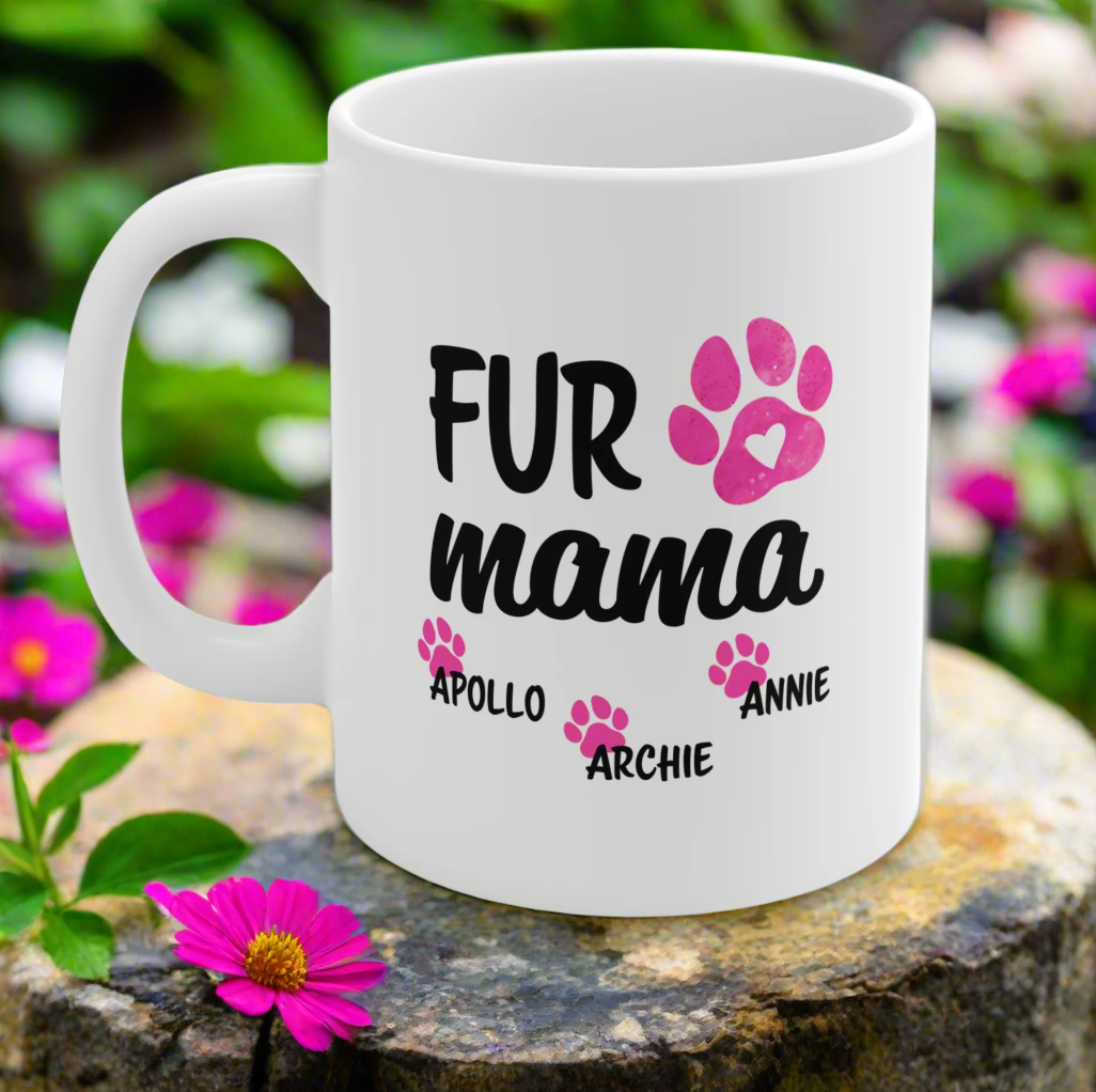 Celebrate your love for your fur babies with this adorable 'Fur Mama' coffee mug! Made from durable 11oz ceramic, this mug features a playful paw print design with the words Fur Mama proudly displayed. The best part? You can personalize it with your dogs’ names, making it a perfect gift for yourself or the dog mom in your life.