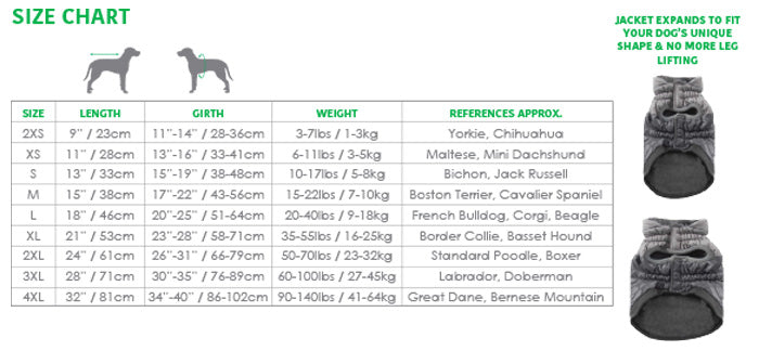 Use sizing section below to select the perfect fit for your pup. We've found that you'll get the best fit if you use your dog's chest measurement to pick a size. If this coat were made for humans, we would call it 'slim fit' and it does run 'short' on many dogs (it won't cover all the way to the tail).