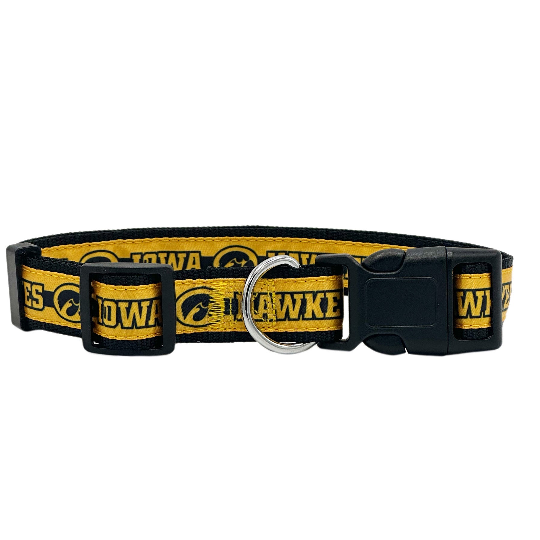 Represent your team in style with the University of Iowa Satin Collar. Made of 100% nylon with an officially licensed team logo and name, this collar is both durable and fashionable. Complete with a silver metal D ring and black clip hardware, it's a must-have for any Iowa fan. Go Hawks!
